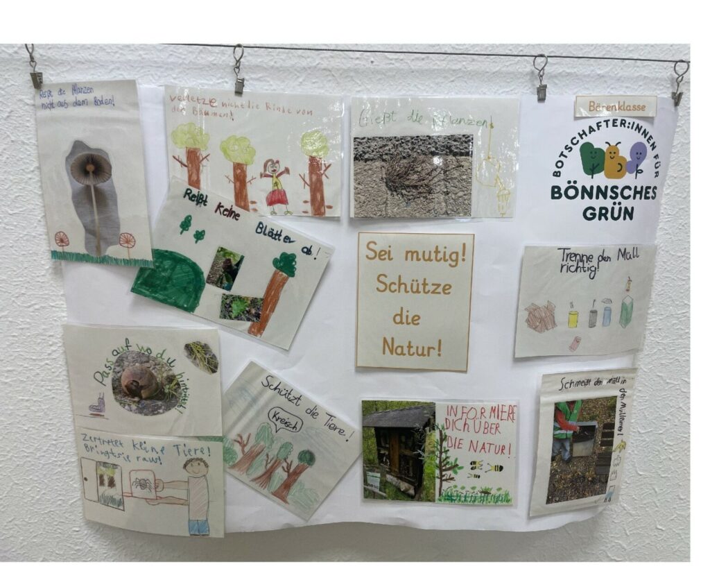 Die Kinder haben außerdem mit ihren eigenen Botschaften ein Plakat gestaltet, das sie in den verschiedenen Klassen vorgestellt haben. Auch für die Schule haben sie Botschaften verfasst, um alle daran zu erinnern, wie wichtig es ist, unsere Umwelt schützen – ganz nach dem Motto: „Sei mutig, schütze die Natur!“